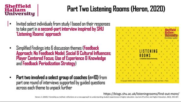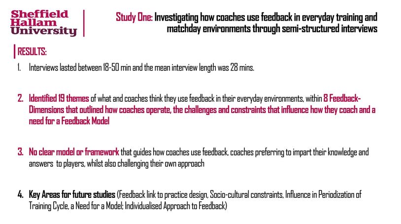 Select group of 10 coaches who unpacked key findings further across 6 Themes: Feedback Approach, No Feedback Model, Social & Cultural Influences, Player Centered Focus, Use of Experience & Knowledge and Feedback Periodization Strategy